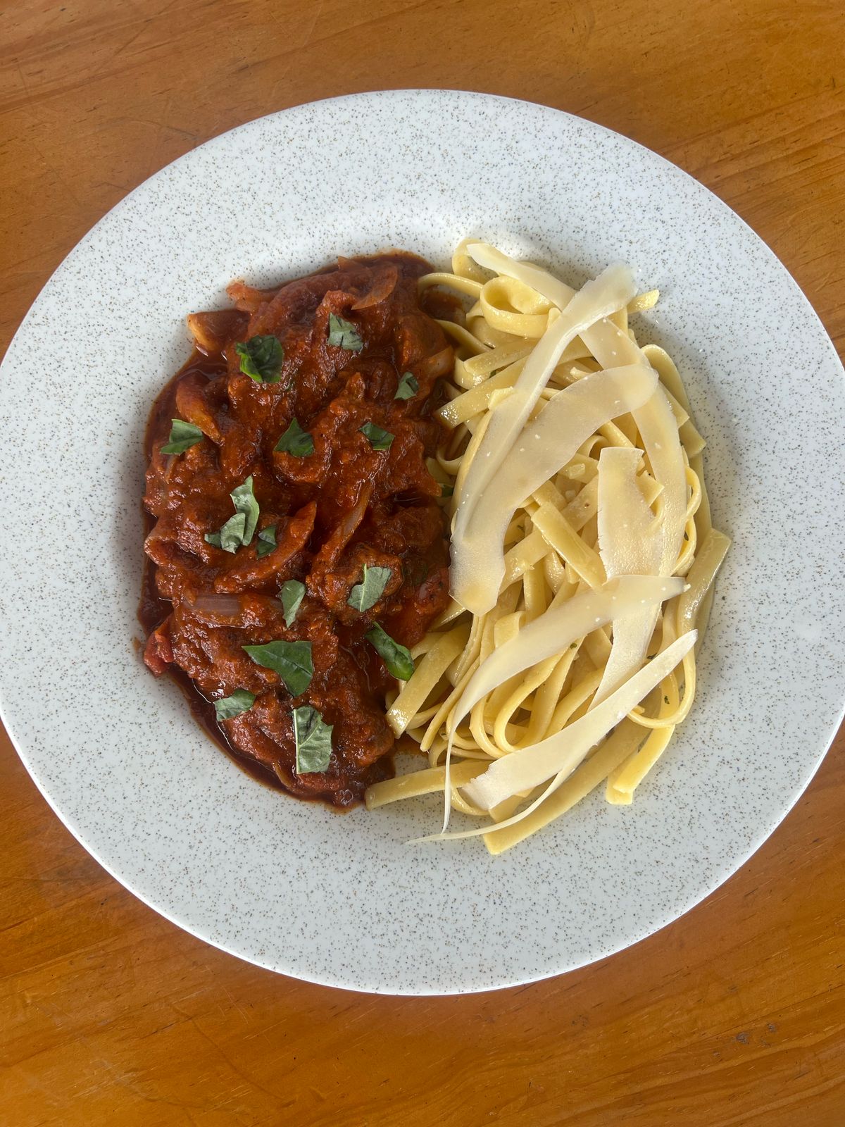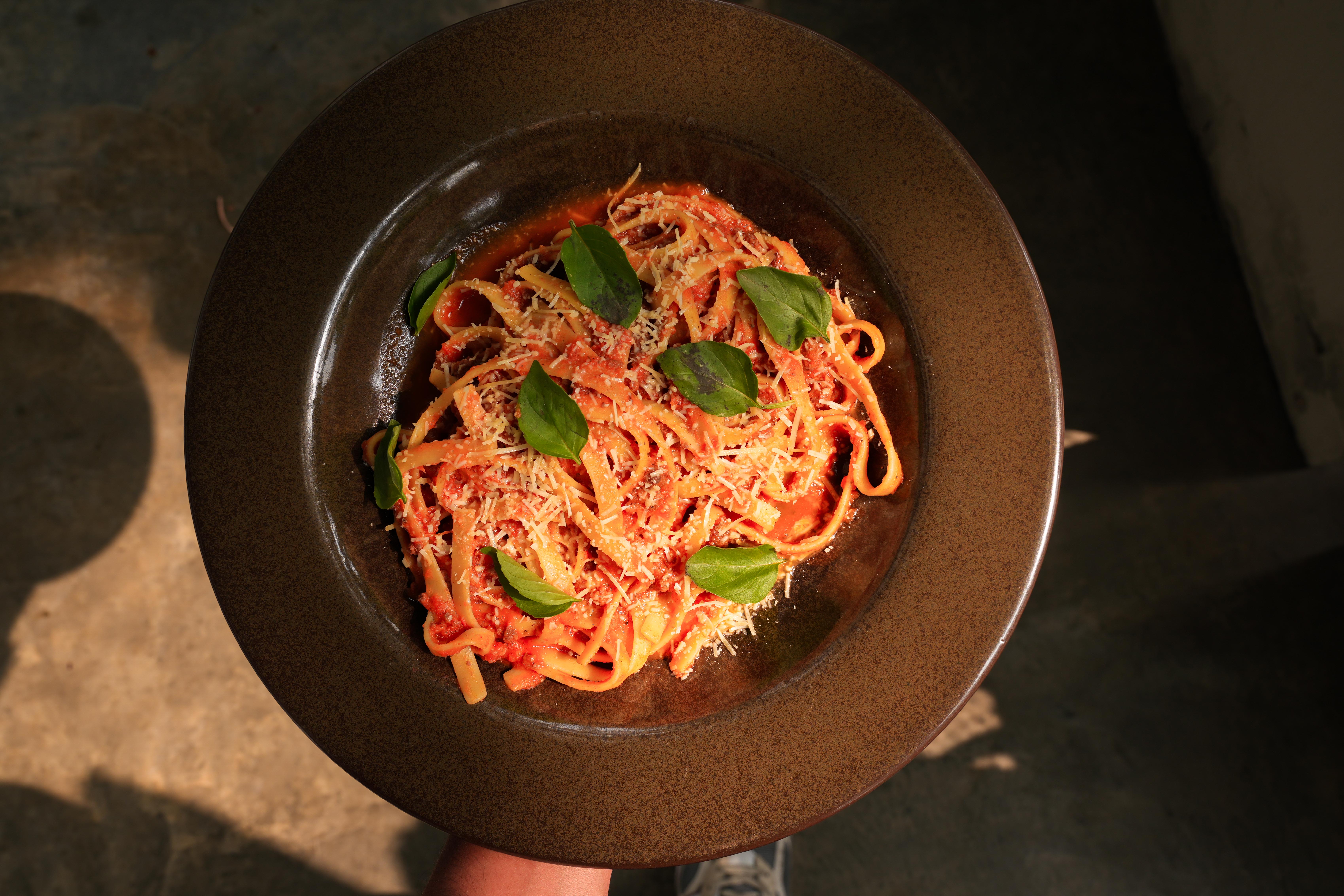 Pasta fresca con salsa boloñesa acompañado de queso parmesano rallado y albahaca genovesa.