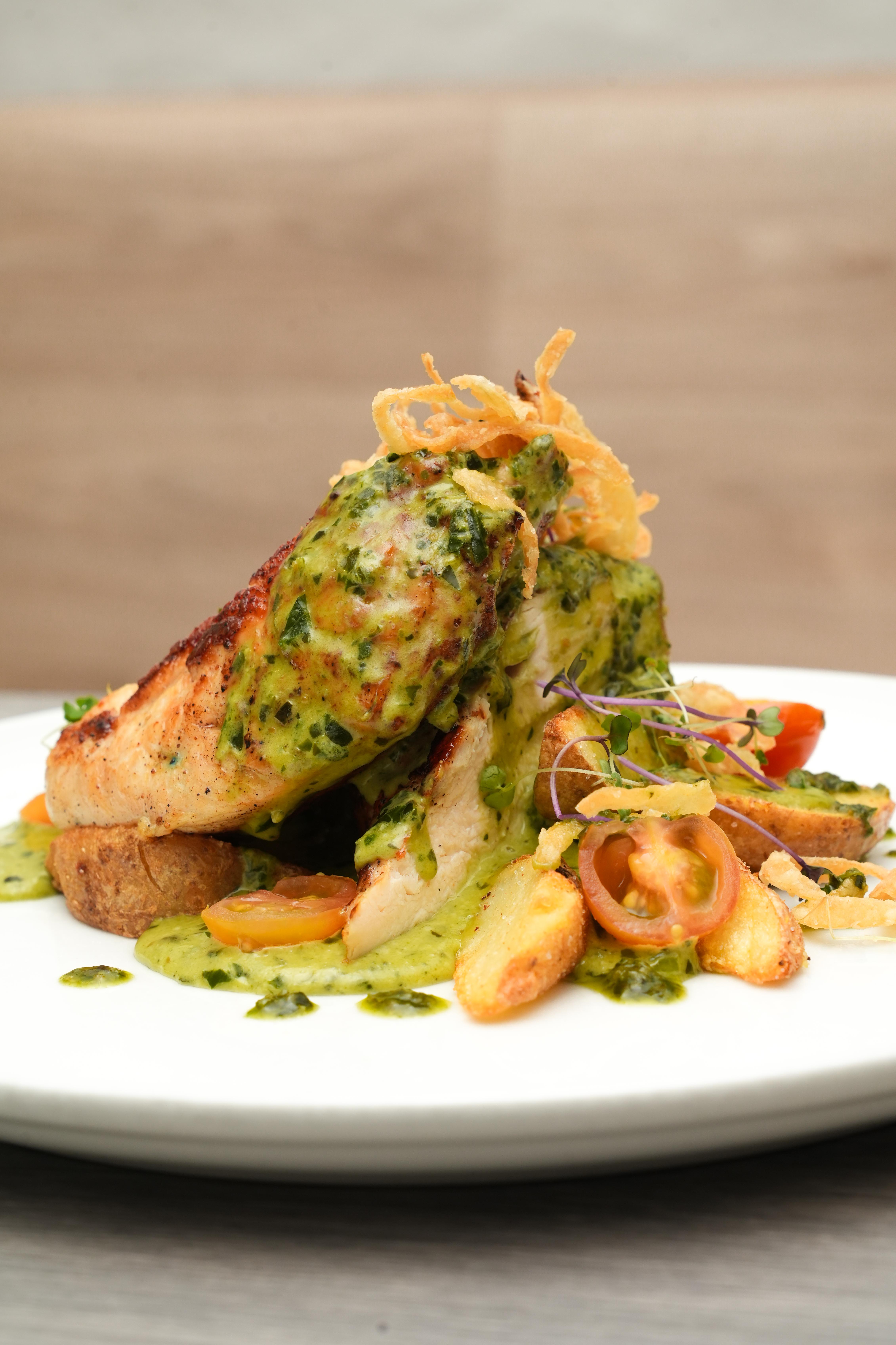 Pechuga de pollo asada sobre papa rustica, tomate cherry y salsa pesto, finalizado con plumas de cebolla crocante.