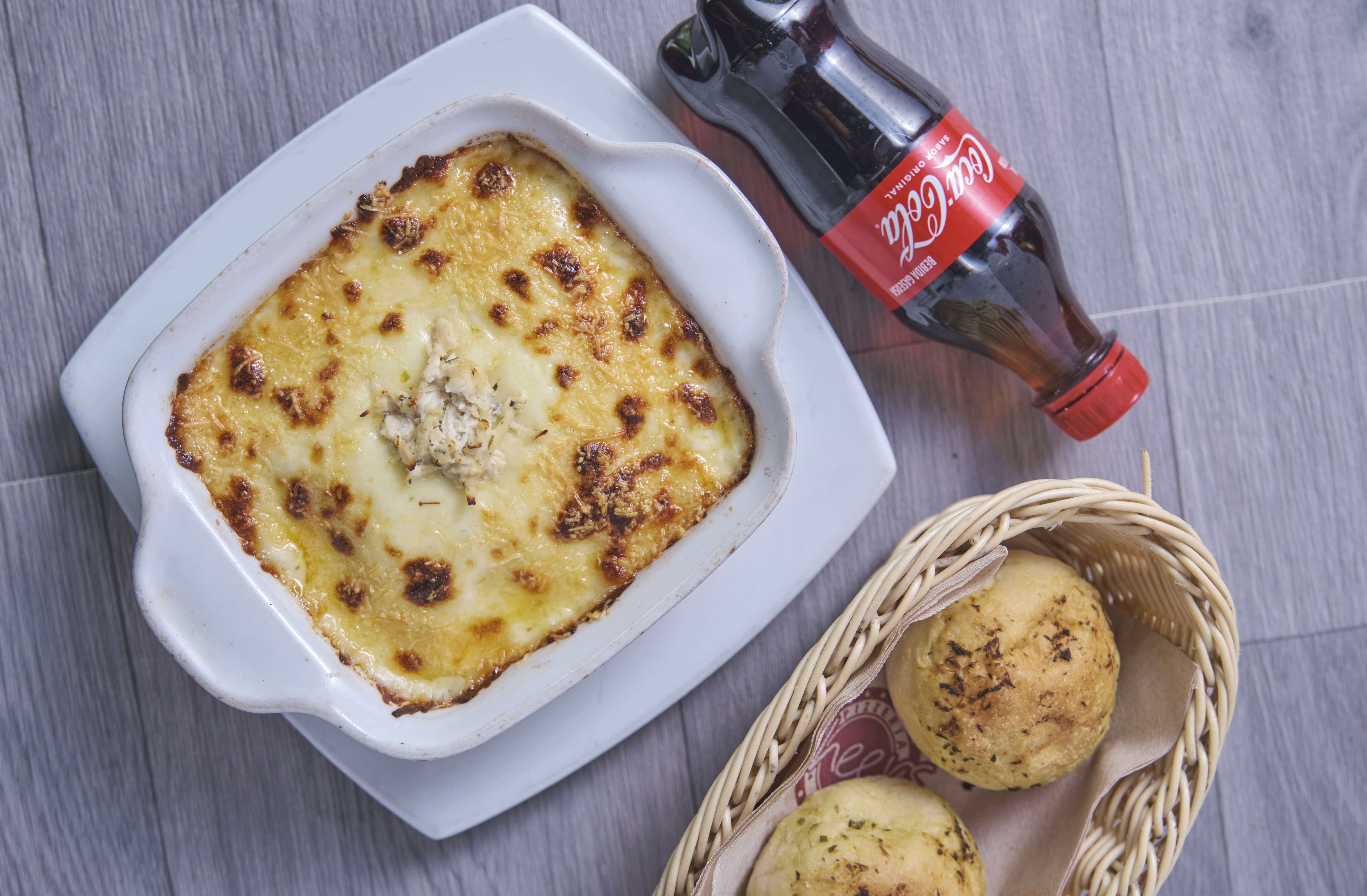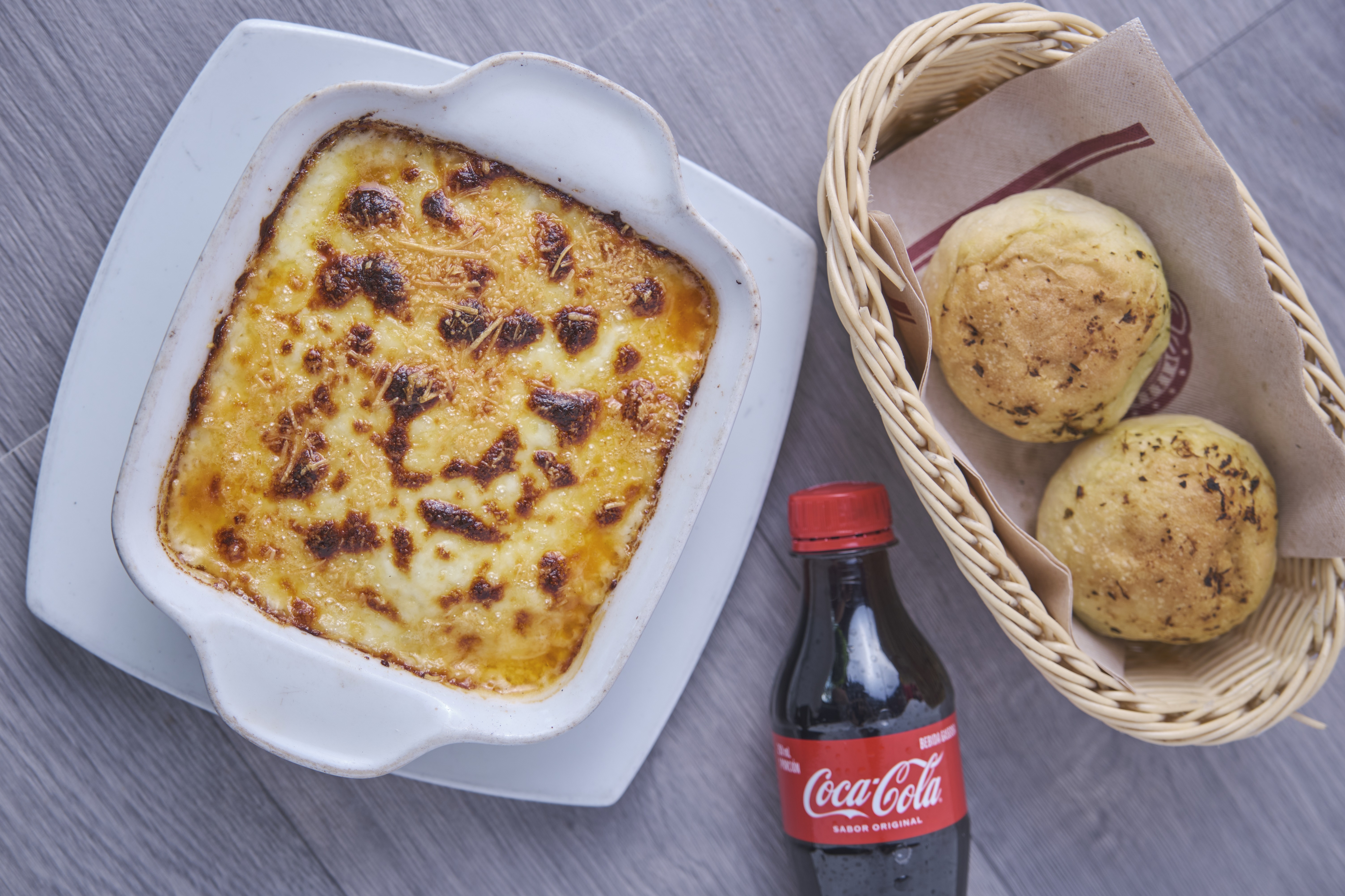Lasagna con salsa de carne a la bolognesa, queso mozzarella y queso parmesano gratinado. Acompañada de 2 panecillos de ajo.