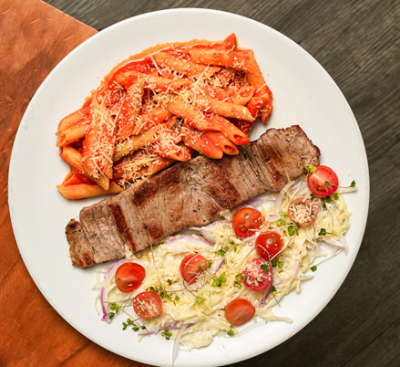 Solomito de cerdo al carbon acompañado de pasta penne napolitana con queso parmesano y ensalada de lechuga, tomate cherry y plumas de cebolla rebozadas en salsa ranch.