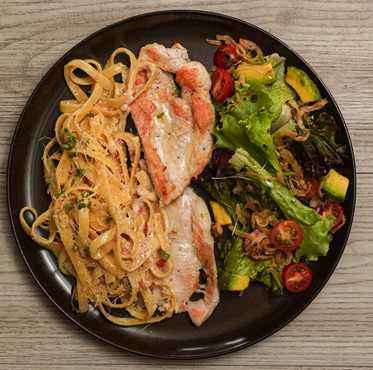 Pechuga de pollo a la plancha acompañado de pasta fetuccini Alfredo y ensalada fresca con aguacate, tomate cherry, hojas de lechuga, salsa pesto y crocante de cebolla puerro.