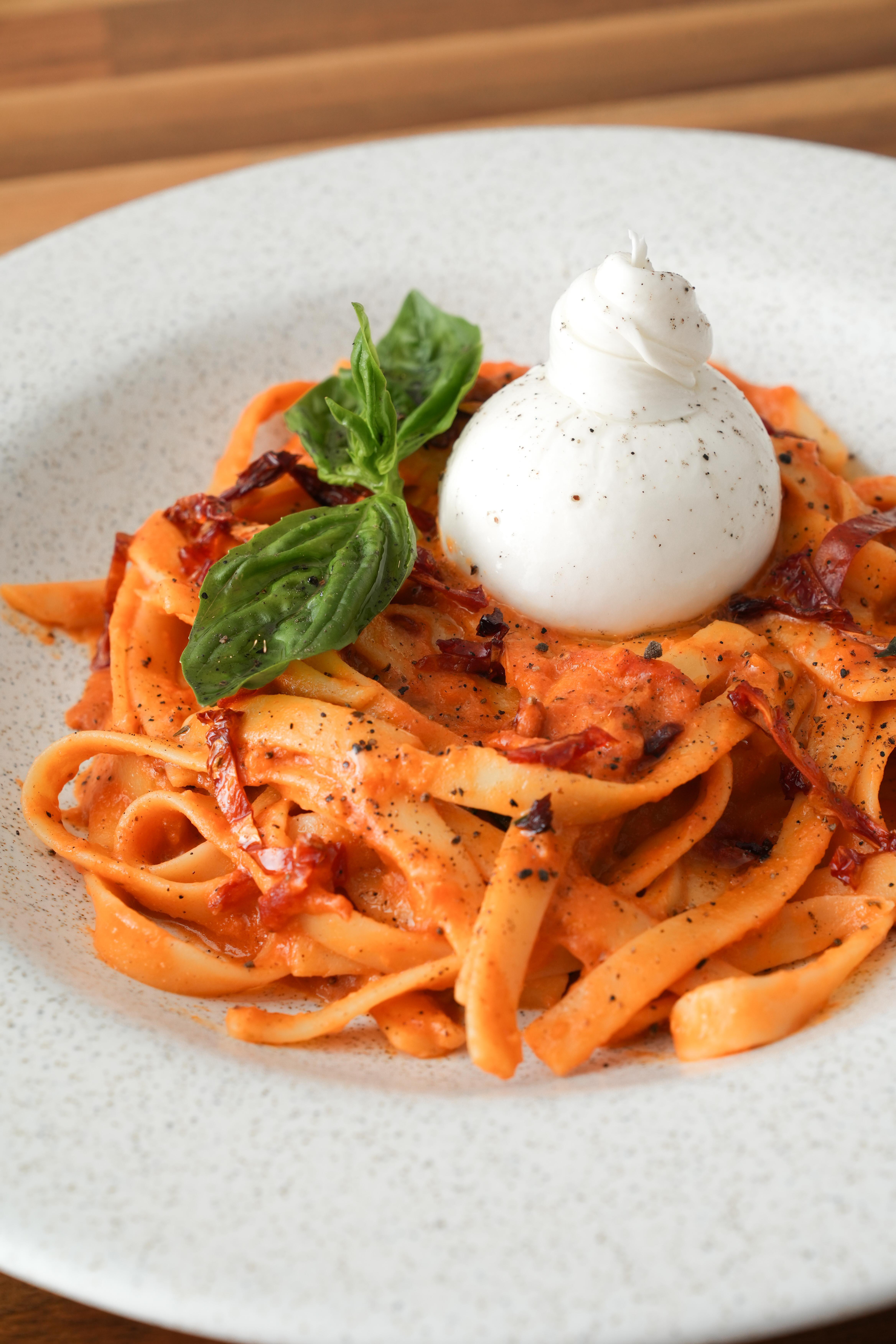 Burrata fresca sobre cama de pasta fetuccini con tomates secos, trozos de albahaca, salsa napolitana y crema de leche.
