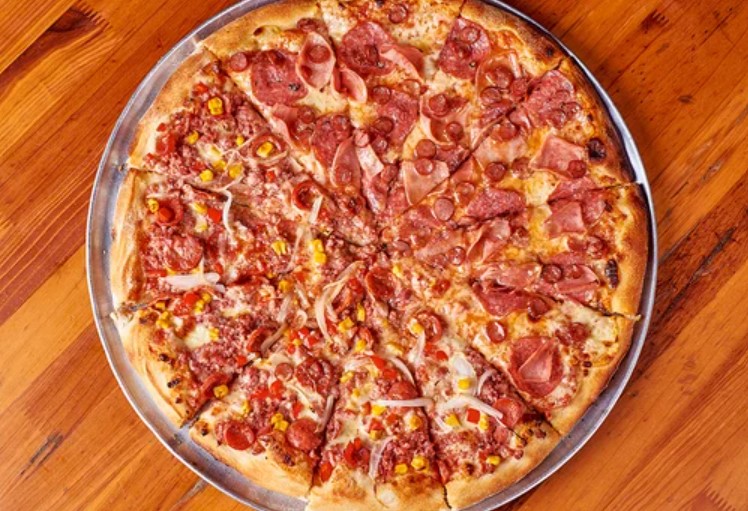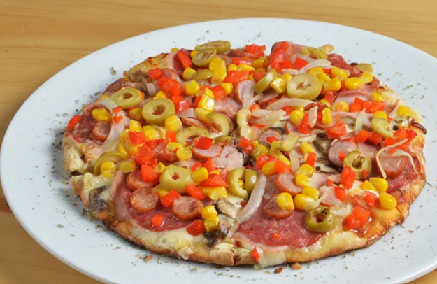 Tamaño personal 6 porciones. Ingredientes: jamón, salami, kabano, champiñones, aceitunas verdes, pimentón, cebolla y maíz.