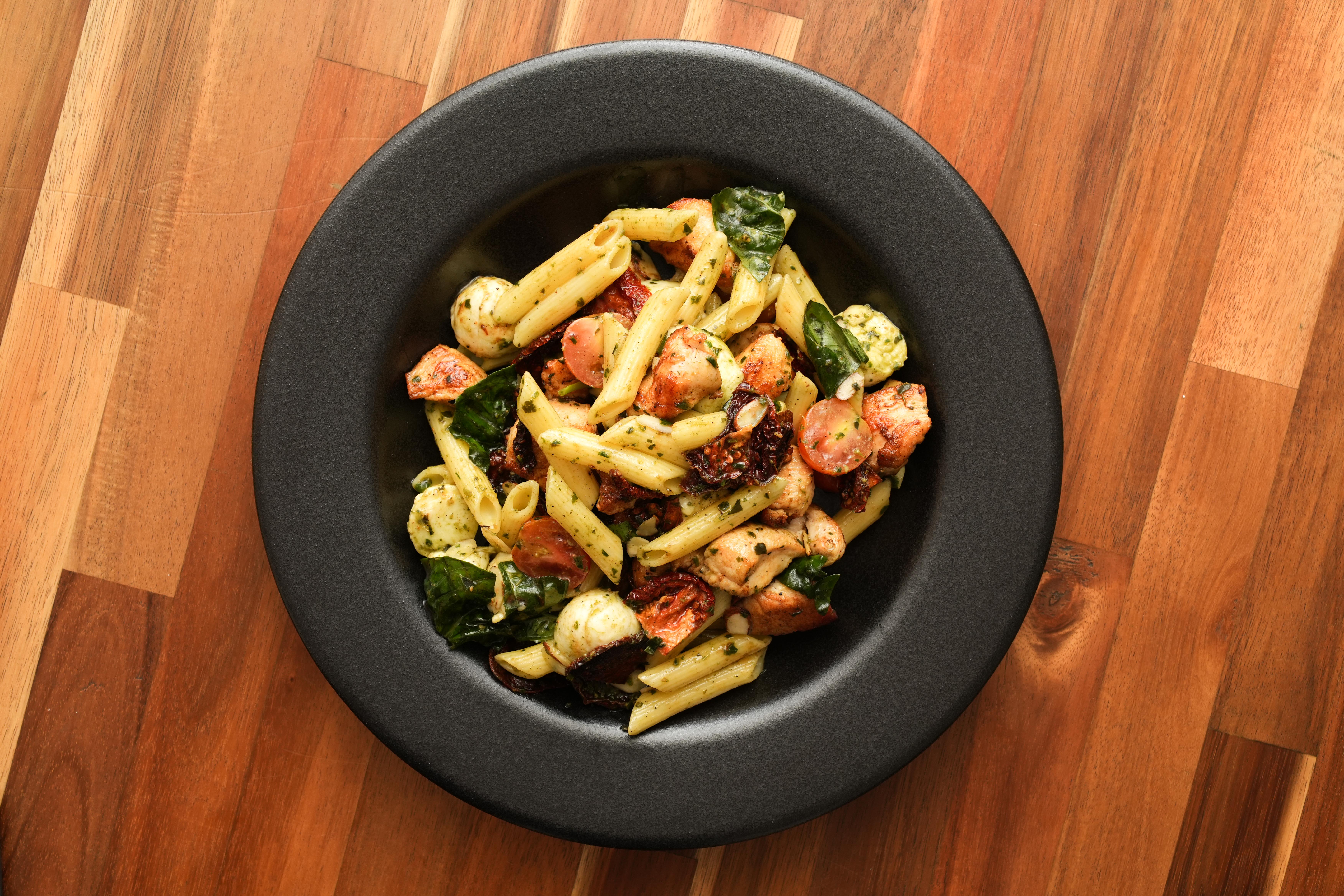 Pasta penne con pollo, salsa bechamel, queso parmesano y albahaca genovesa.