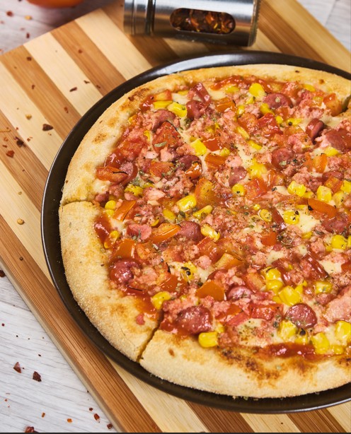 Tamaño personal 6 porciones. Ingredientes: chorizo, maíz, tocineta, cebolla y pimentón. A partir del tamaño pequeña puedes elegir más de un sabor.