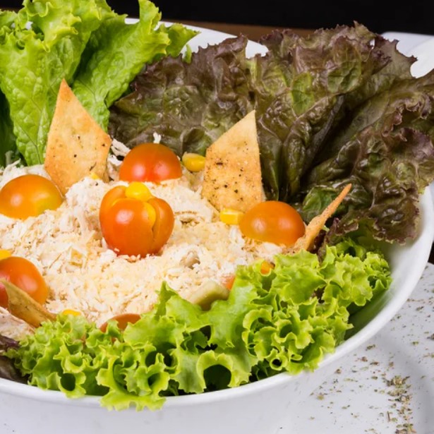 Mix de lechugas, rúgula, aceitunas verdes, maíz, champiñones, tomates cherry, fancachas, pollo y parmessano