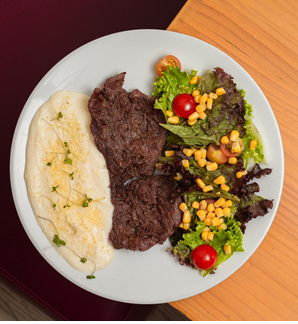 Lomo de res acompañado de puré cremoso de papa con queso parmesano y ensalada del huerto con maicitos, tomate cherry, mix de lechuga en jarabe de balsamico y tomillo.