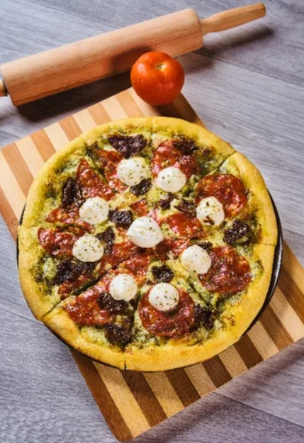 Tamaño personal 6 porciones. Ingredientes: pesto, queso mozzarella, chorizo español, tomates deshidratados, queso de búfala y orégano seco.
