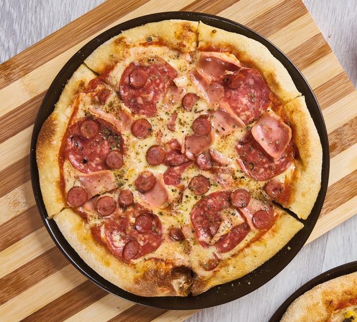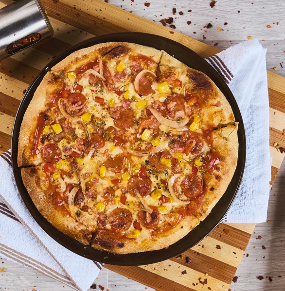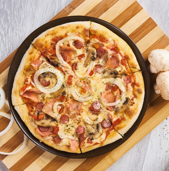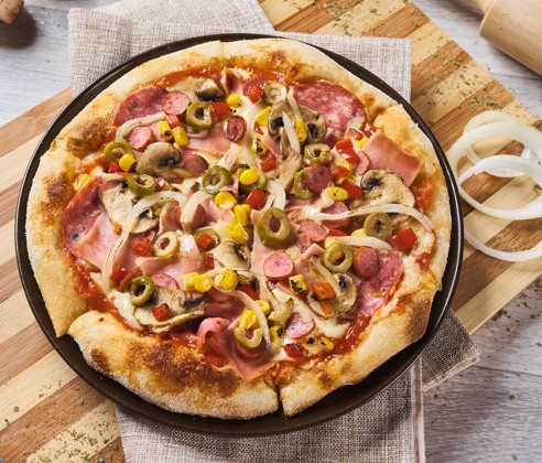 Tamaño personal 6 porciones. Ingredientes: jamón, salami, kabano, champiñones, aceitunas verdes, pimentón, cebolla y maíz.