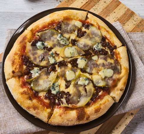 Tamaño personal 6 porciones. Ingredientes: tocineta crocante en reducción de balsámico e higos, manzana caramelizada y queso azul.