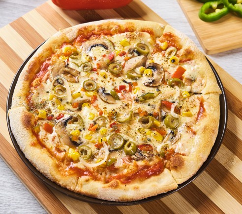 Tamaño personal 6 porciones. Ingredientes: maíz, aceitunas verdes, cebolla, pimentón y champiñones. A partir del tamaño pequeña puedes elegir más de un sabor.