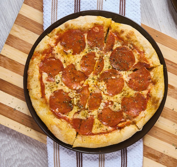 Tamaño personal 6 porciones. Ingredientes: salsa napolitana, queso mozzarella y pepperoni.