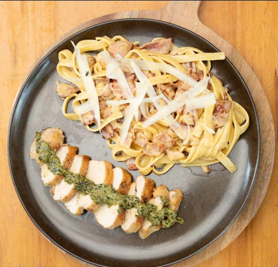 Pasta fetuccini con con salsa carbonara al estilo italiano con huevo, queso grana padano y tocineta rostizada.