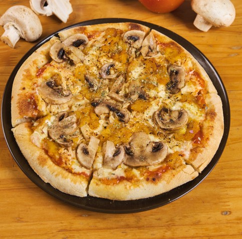 Tamaño personal 6 porciones. Ingredientes: pollo, champiñones y maduro. A partir del tamaño pequeño puedes pedir más de un sabor.