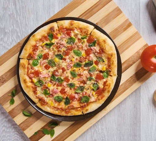 Tamaño personal 6 porciones. Ingredientes: tocineta, tomate, maíz, albahaca y aceite de oliva. A partir del tamaño pequeña puedes elegir más de un sabor.