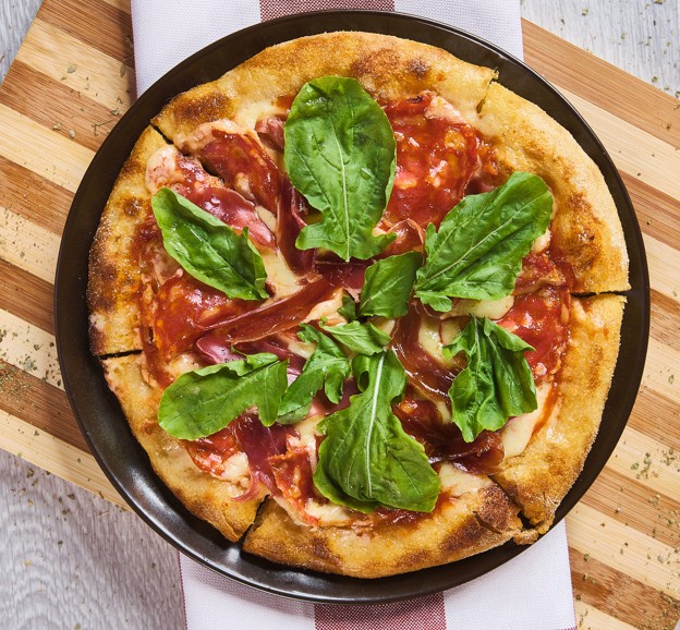 Tamaño personal 6 porciones. Ingredientes: chorizo español, rúgula y jamón serrano.