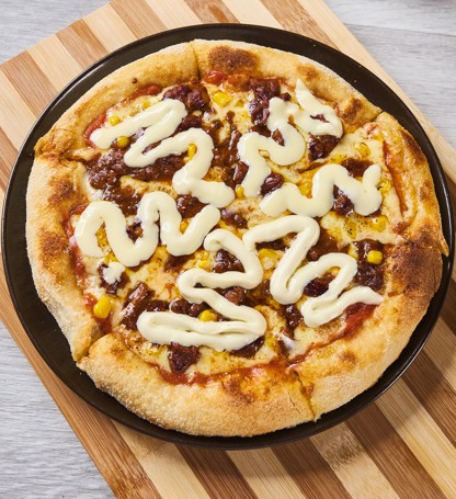 Tamaño personal 6 porciones. Ingredientes: chorizo, maíz, tocineta, cebolla y pimentón. A partir del tamaño pequeña puedes elegir más de un sabor.
