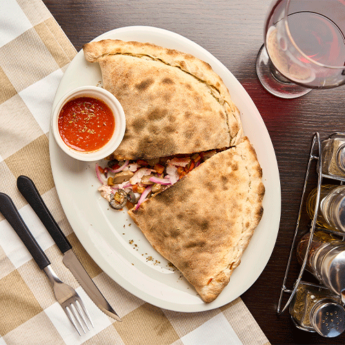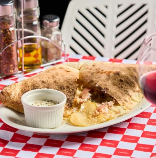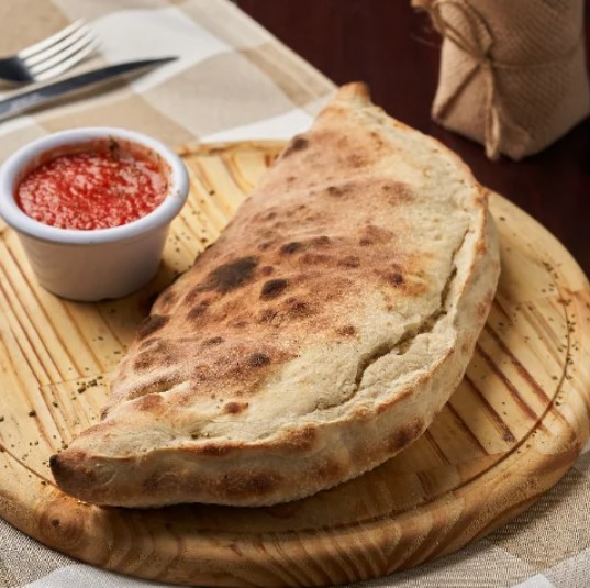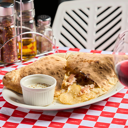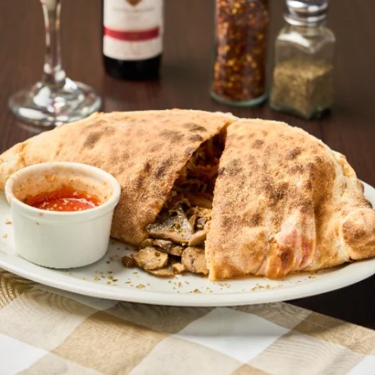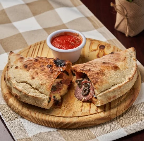 Calzone con salsa pomodoro, queso mozzarella, salame, tocineta, champiñones, aceitunas negras, cebolla y pimentón fresco.