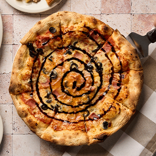 Salsa pomodoro, queso mozzarella, queso azul, tocineta, ciruela y reducción de vinagre balsámico.