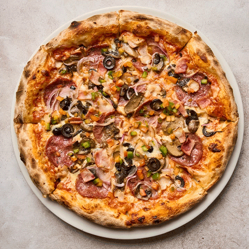 Salsa pomodoro, queso mozzarella, salame, tocineta, champiñones, aceitunas negras, cebolla y pimentón fresco.