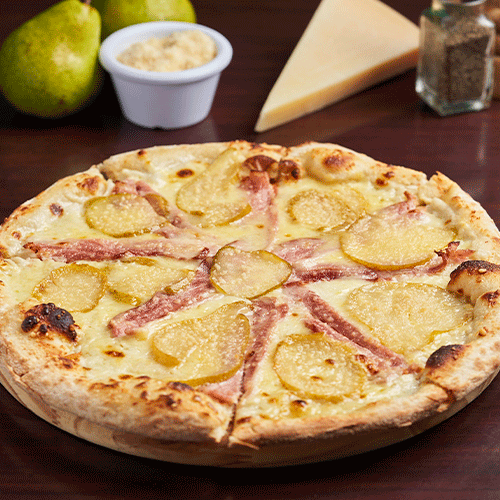 Base de salsa de queso azul, quesos mozzarella y parmesano, tocineta, peras caramelizadas y un toque de queso azul.