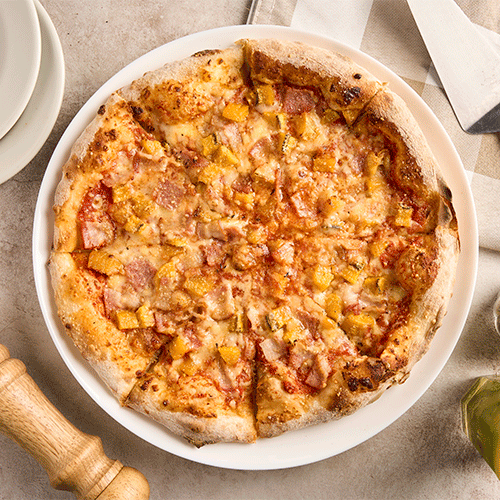 Salsa pomodoro, queso mozzarella y parmesano, tocineta y maduro.