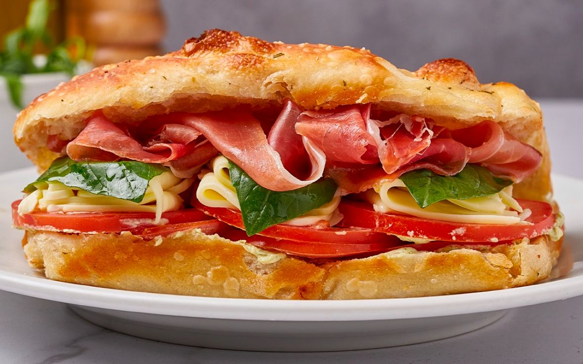 Focaccia, prosciutto, crema pesto, queso mozzarella, tomate, albahaca y aceite de oliva extra virgen