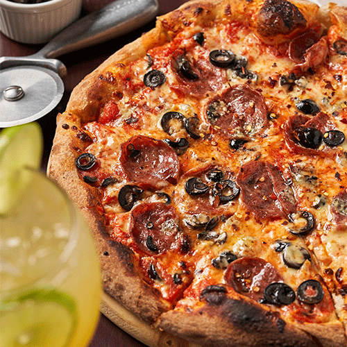Salsa pomodoro, queso mozzarella, queso azul, salame, aceitunas negras y un poco de peperoncino.