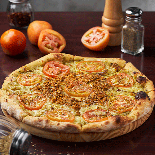 Salsa pesto, queso mozzarella, pollo, tomate en rodajas y un poco de orégano.