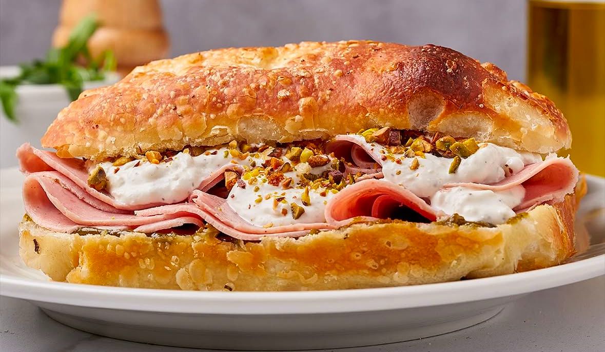 Focaccia, Mortadela tipo italiana, crema de pistacho, queso stracciatella, pistacho triturado y aceite de oliva extra virgen