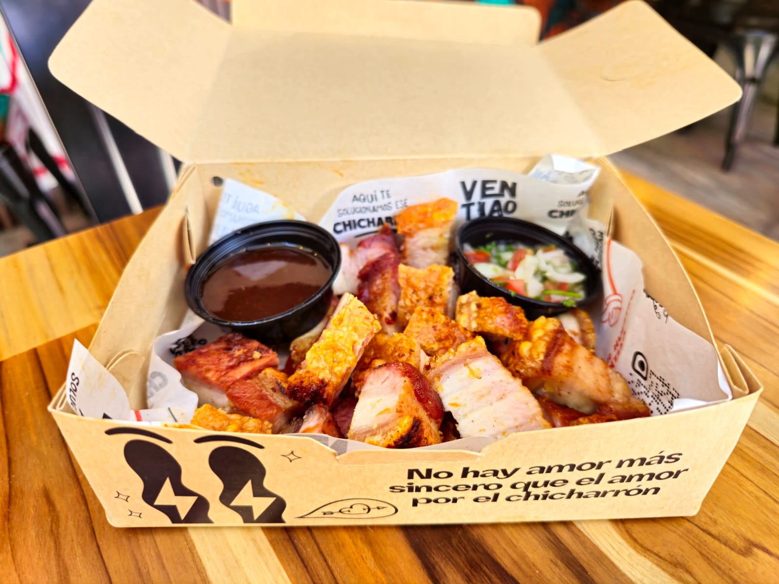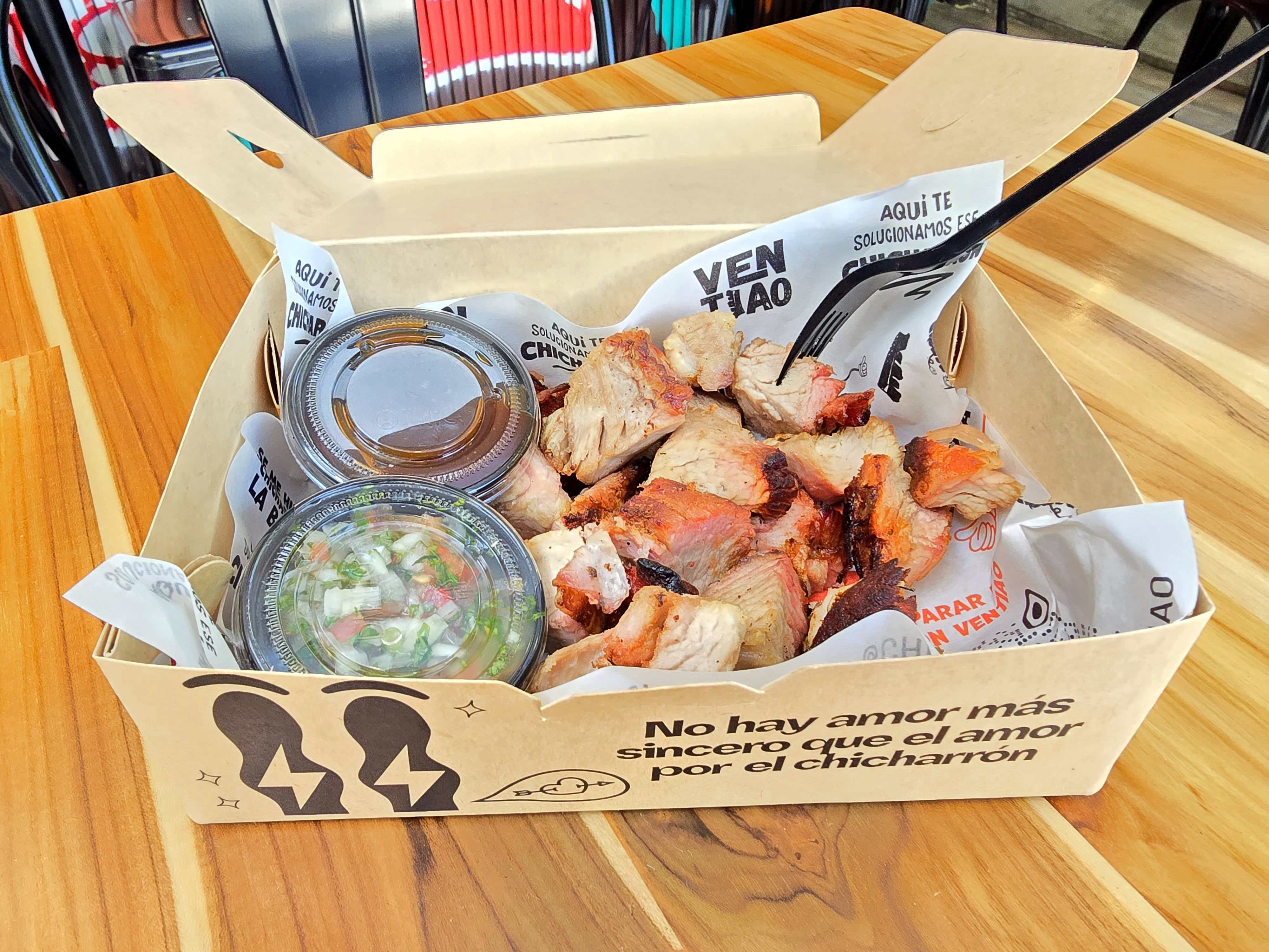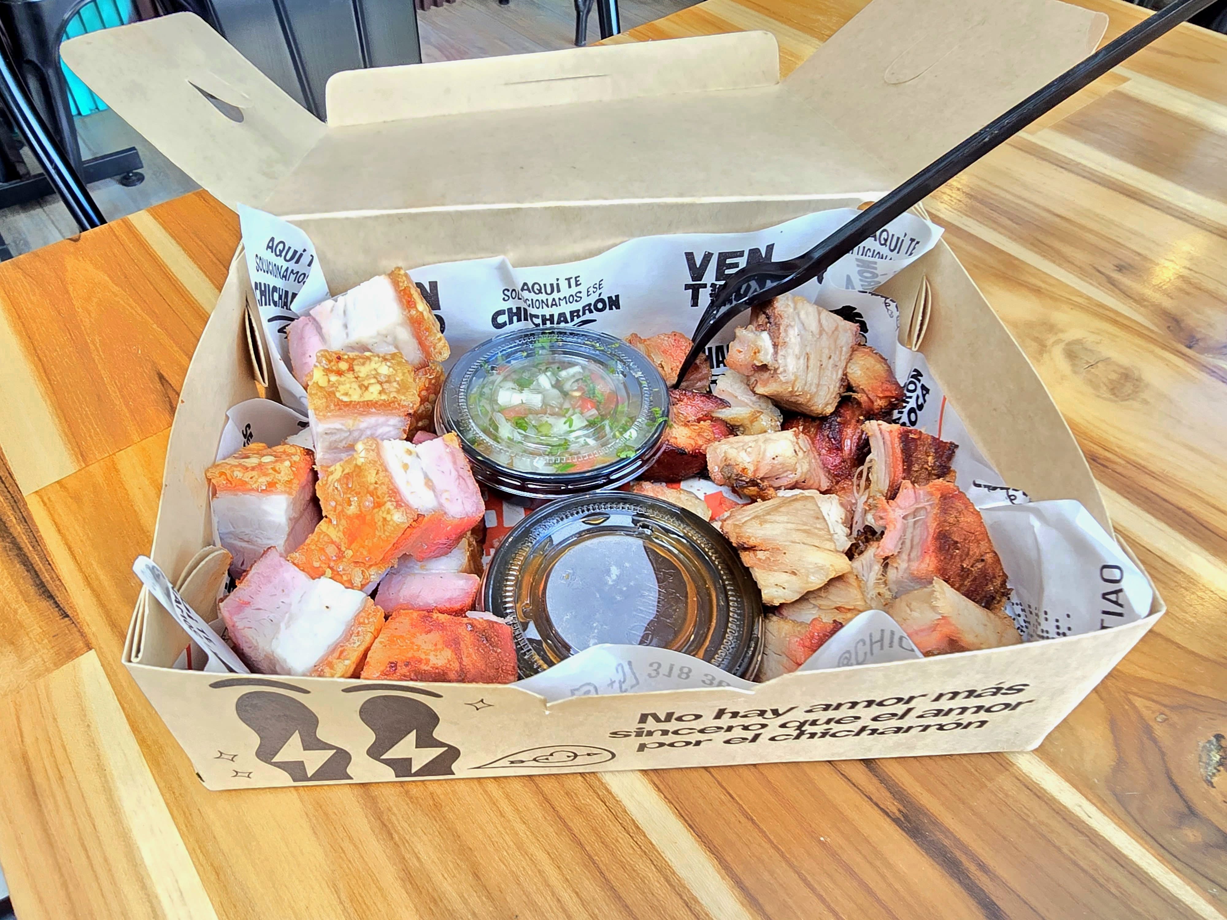 Porción personal de 260 gr de Chicharron crocante preparado al barril con papa acompañado de nuestra salsa verde, salsa barbecue y pico de gallo.