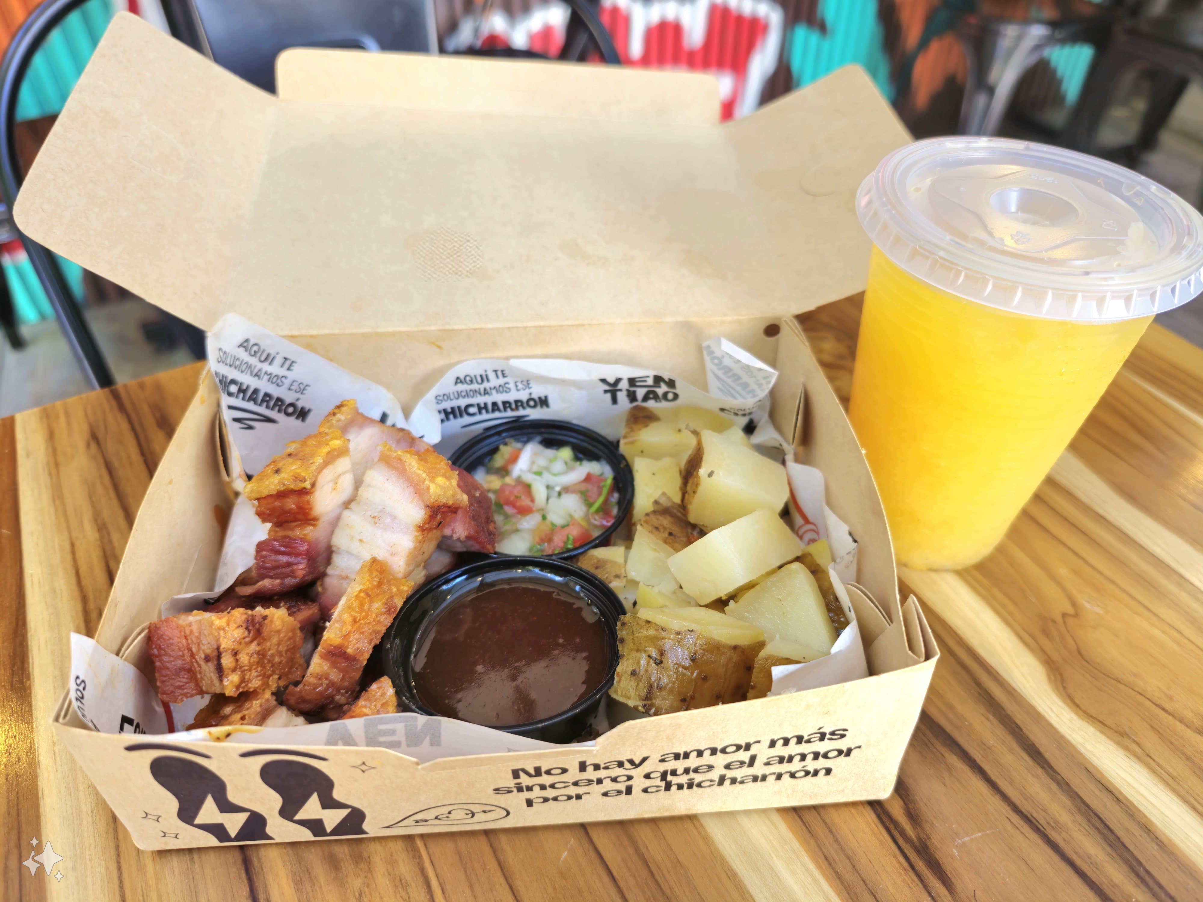 162 g de chicharrón preparado al barril acompañado de papa al horno y agua de panela de maracuyá o Limón. .