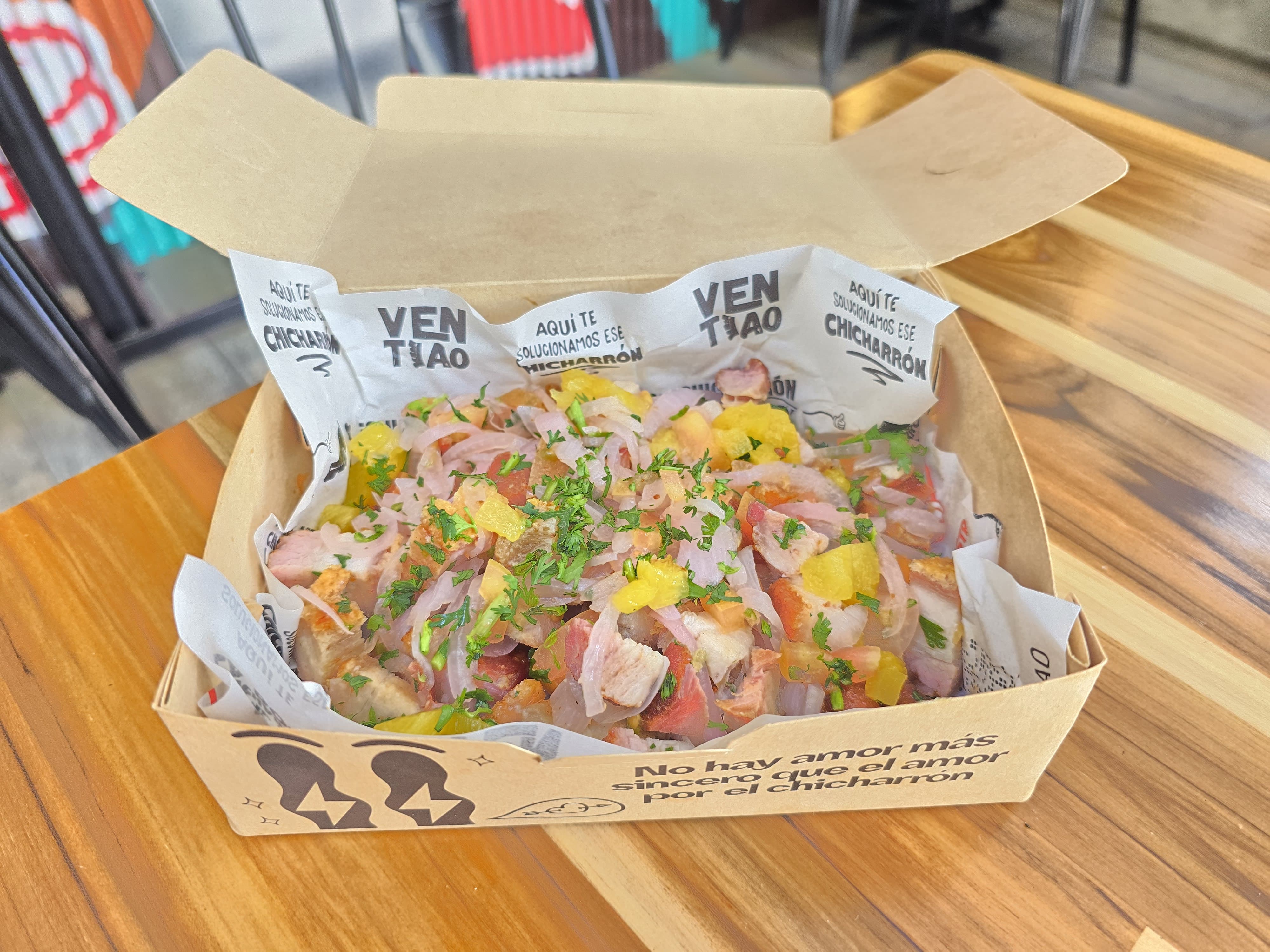 Delicioso ceviche personal de chicharrón al barril, preparado con finos cortes de chicharon con papa al horno y deliciosa salsa de la casa.