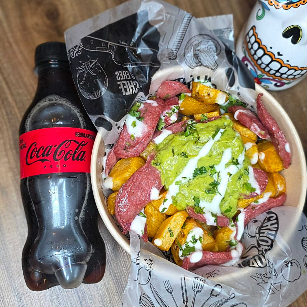 Burrito mixto trifasico (carne molida, pollo y pulled pork), pico de gallo, guacamole, queso rallado, chilli con carne, salsa de tocineta + nachos con queso cheedar + bebida 250ml a eleccion