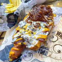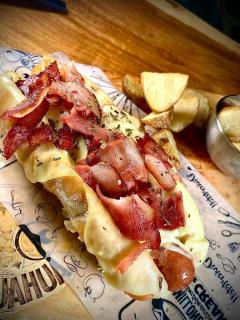 la mejor slachicha tipo frankfurt gratinada en doble queso mozarrella, maduro guayabo, costilla ahumada, tocineta y salsas de queso cheddar + papas