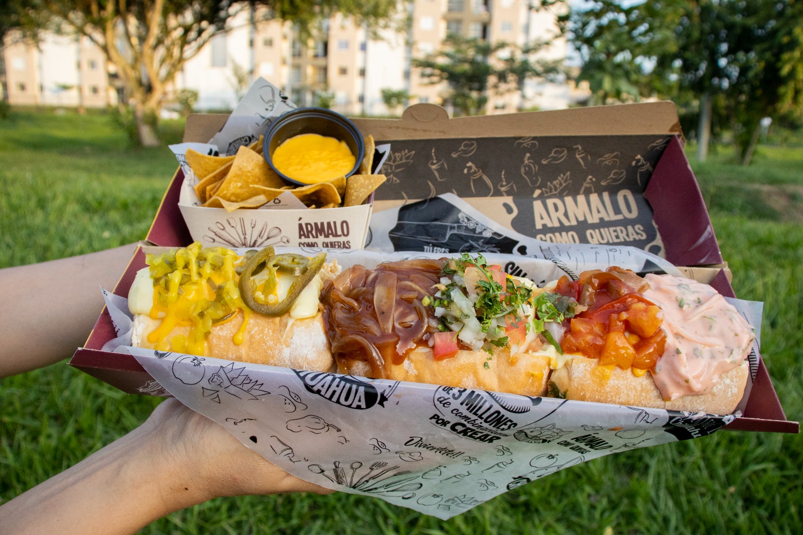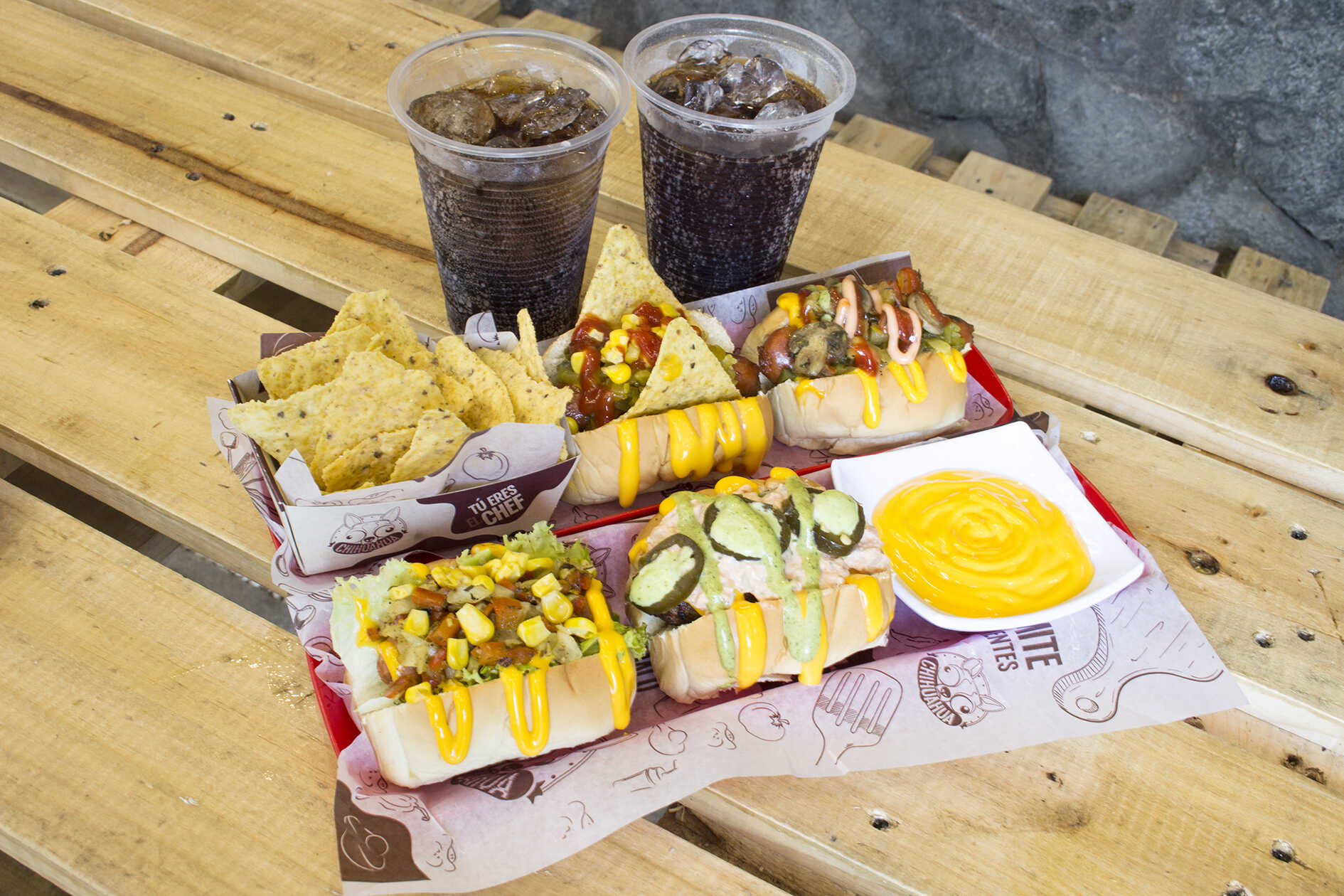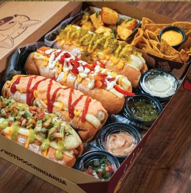 4 Chihuahueños de 10 cm, puedes elegir entre salchicha americana, chorizo o vegetariana todas iguales o todas diferentes, elige entre totopos o papas a la francesa y 2 gaseosas mini.