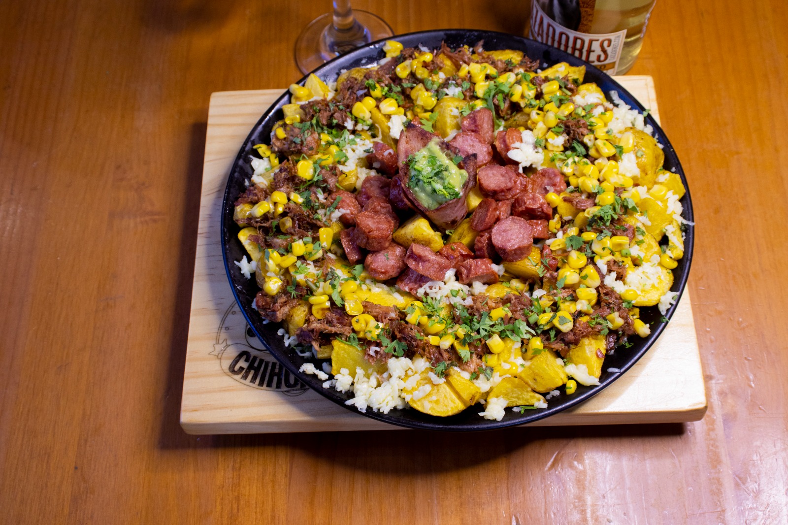 Salchicha ranchera, papa criolla, costilla desmechada, tqocineta, maíz, queso mozarella y salsas de la casa