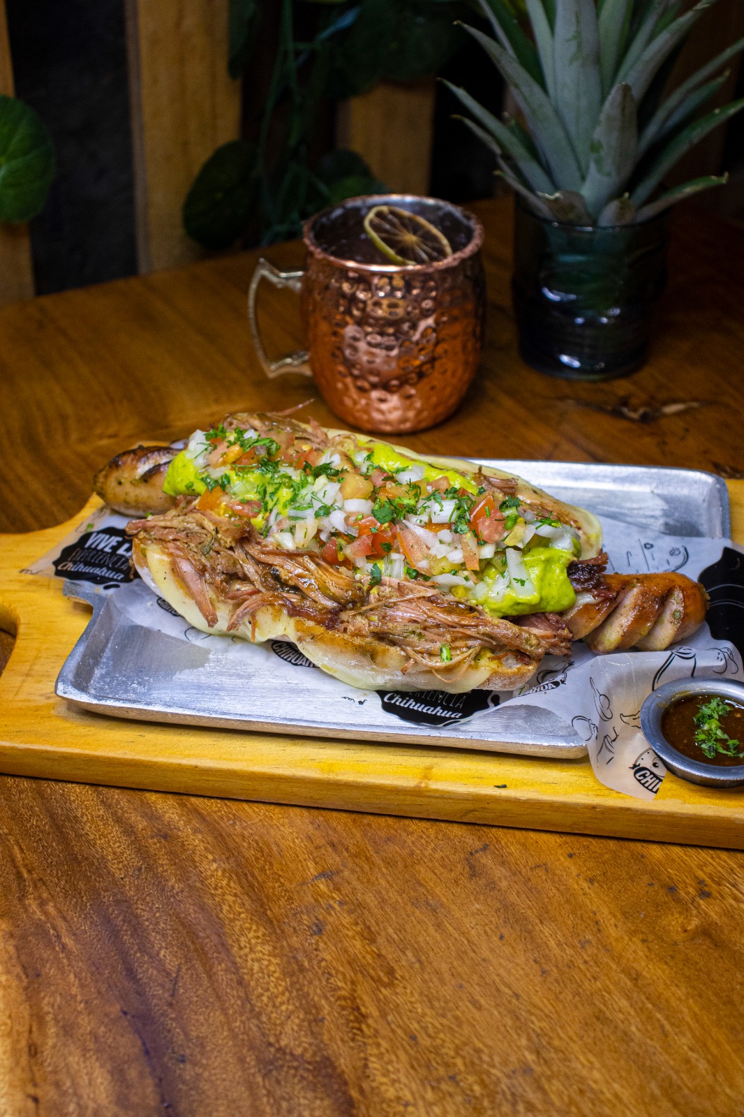Salchicha Alemana kaiser de 30cm, gratinado con doble queso mozarella, costilla desmechada, guacamole y picó de gallo + papas