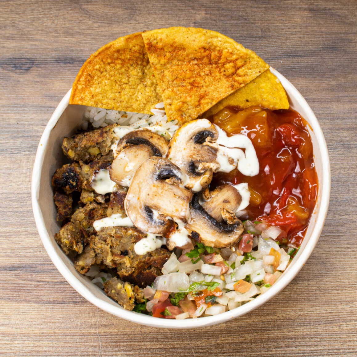 1 porcion de arroz, pico de gallo, salsa hawaiana, carne vegetariana, champiñones, nachos y va con toppings