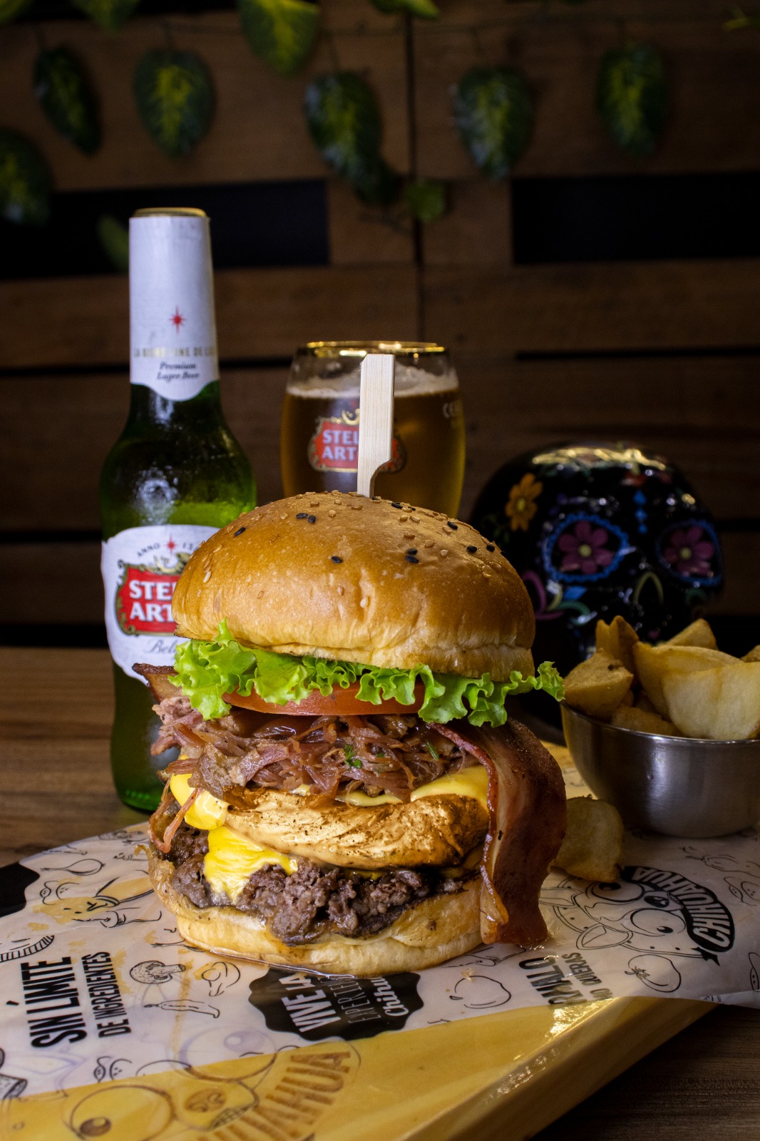 Pan artesanal doble carne, doble tocineta, doble queso cheddar, queso mozzarella, tomates frescos y lechuga fresca.
