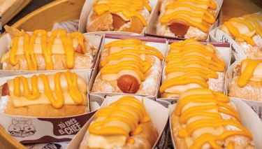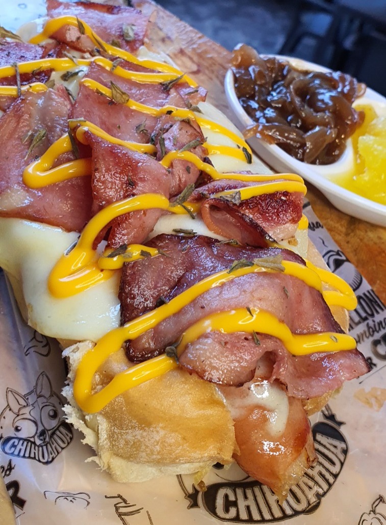 3 chihuahueños de 10cm, Pan artesanal, elige la salchicha americana, chorizo o vegetariana, queso mozzarella y cheddar.