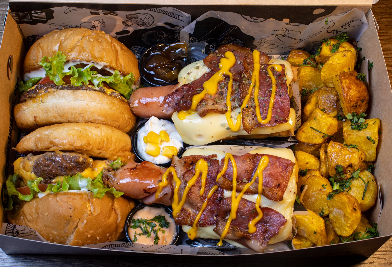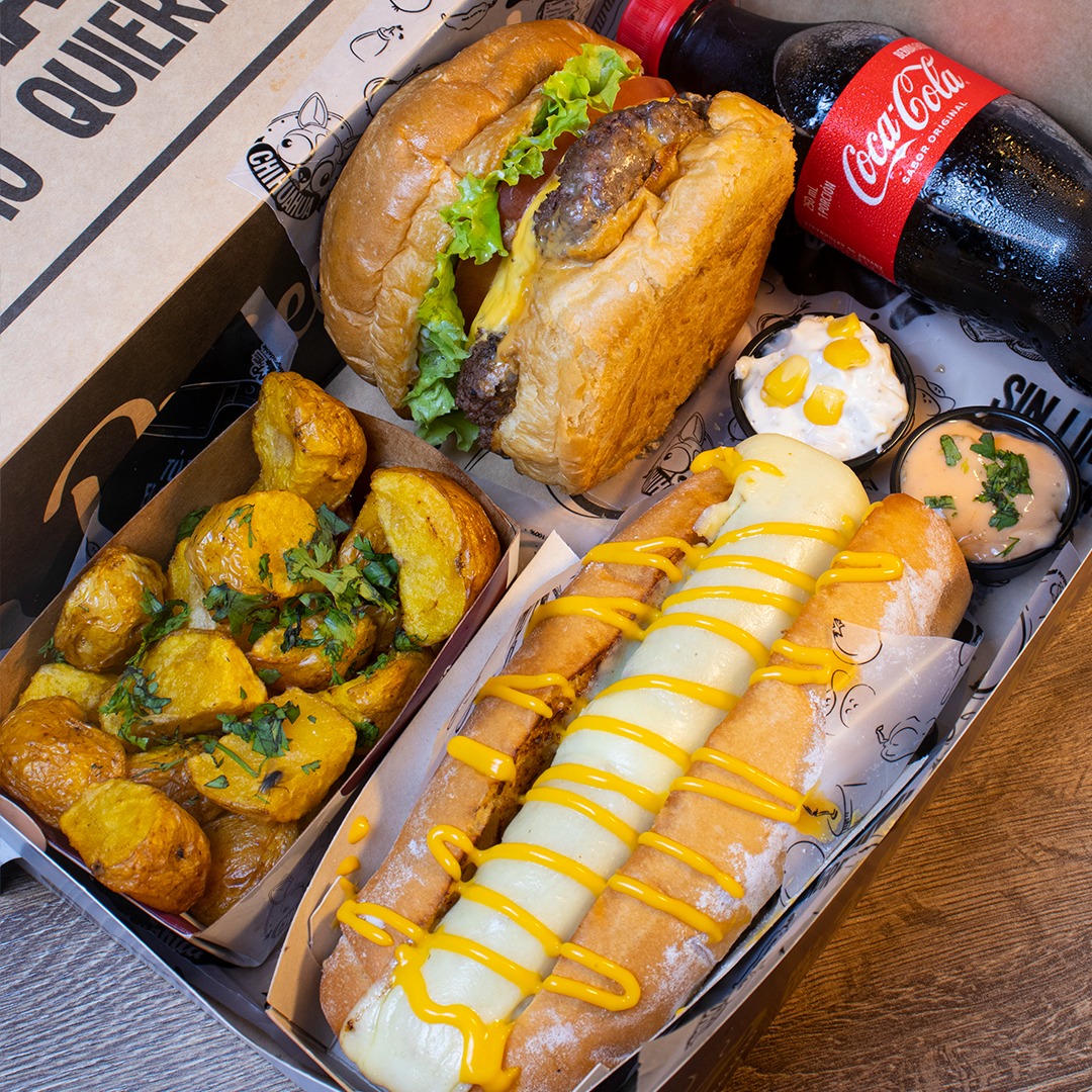 2 perros americanos + 2 hamburguesas barra libre + 1 porción de papas criollas + 1 porción de nachos con cheddar