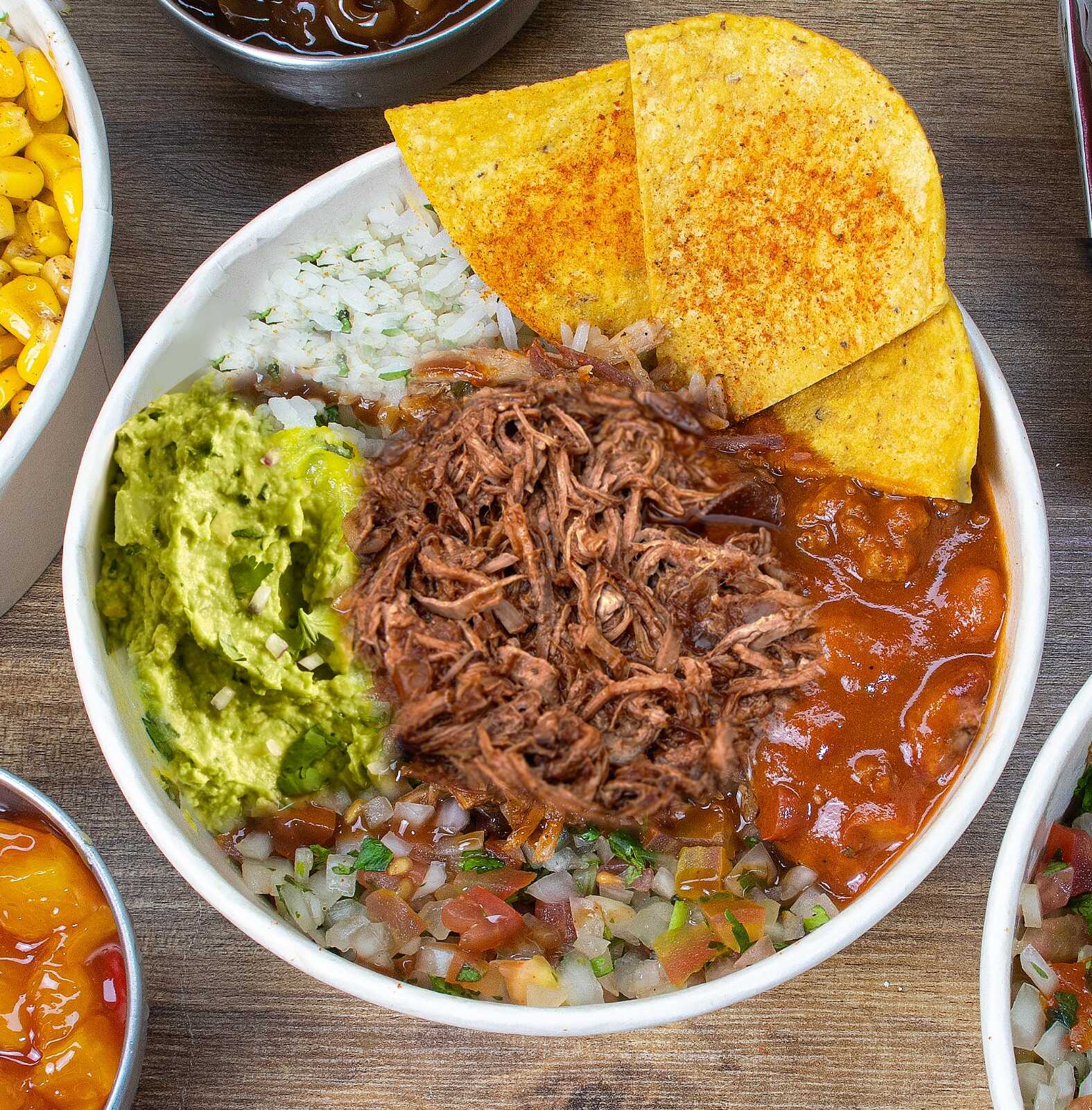 1 porcion de arroz, porcion de pollo desmechado, maicios, pico de gallo, salsa de zanahoria, nachos. Van con toppings