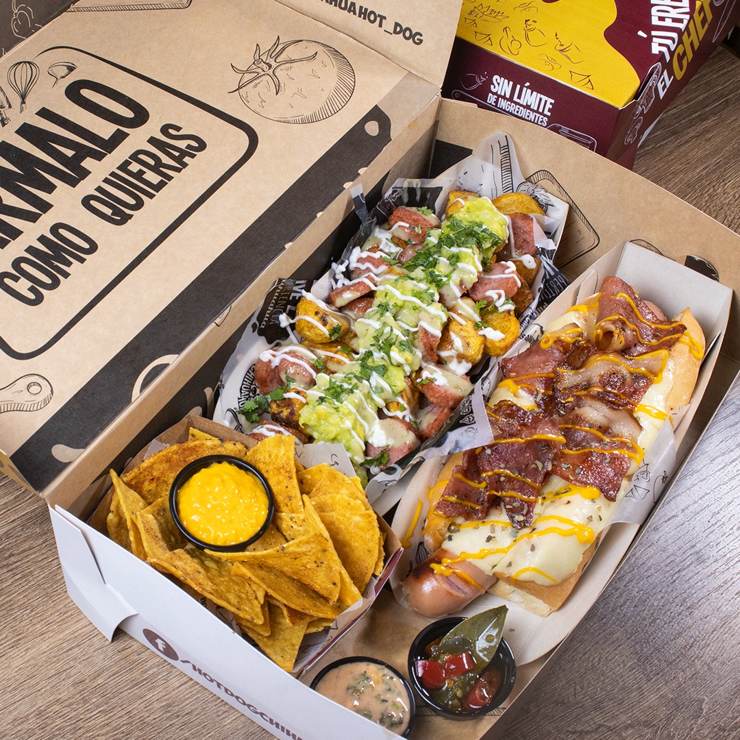 (1) perro aleman doble queso y tocineta (1) salchipapa ranchera con guacamole y una porcion de nachos con queso cheddar