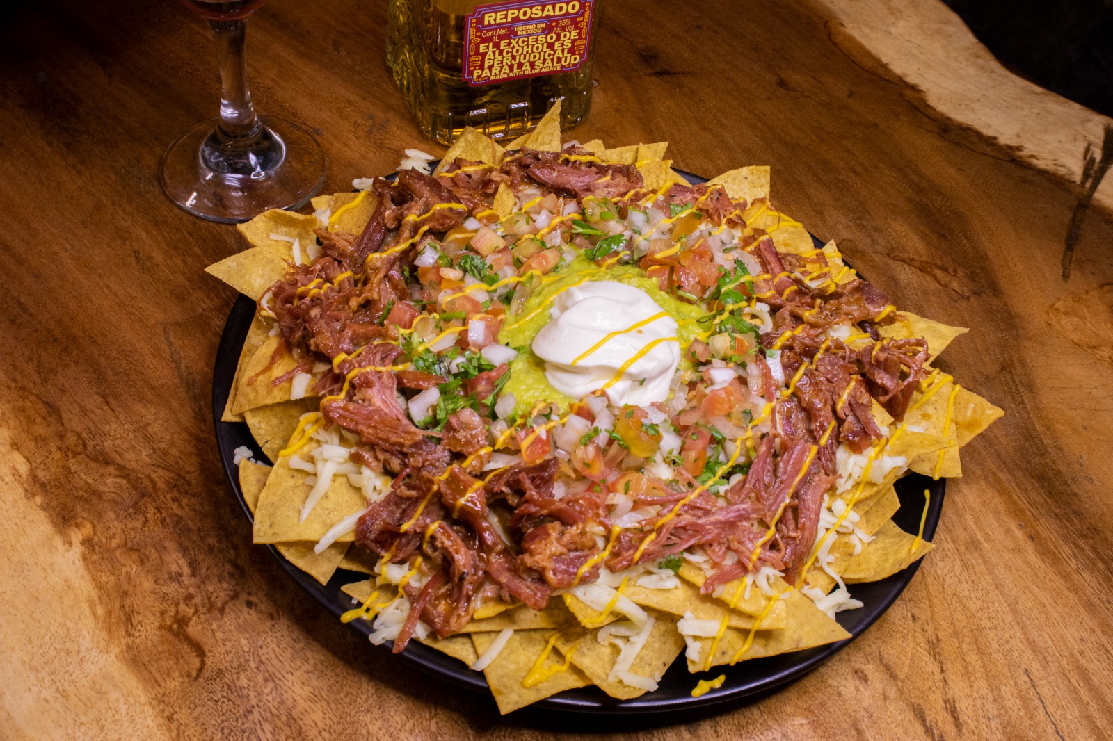 Totopos con queso mozarella rallado, costilla ahumada despechada, picó de gallo, guacamole, sour créame y salsas de la casa