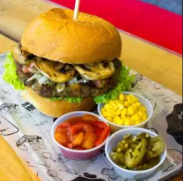 Pan artesanal,carne de lentejas,champiñones,queso mozarella,lechuga + papas