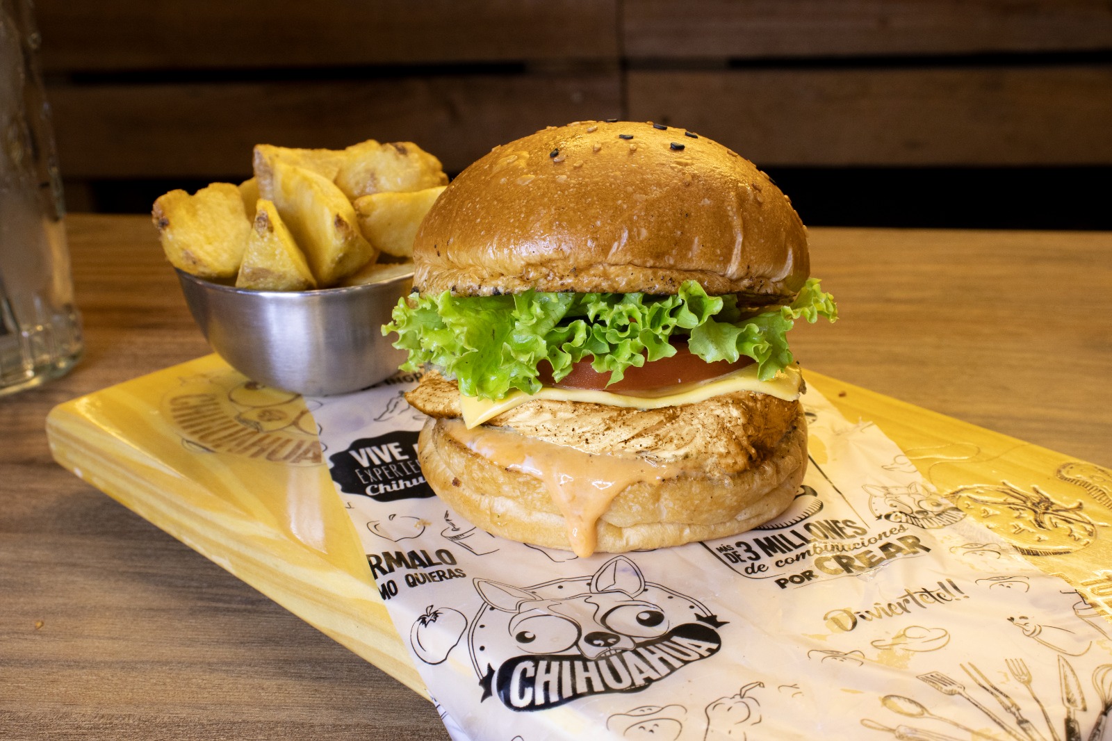 Hamburguesa de pollo 150gr, lechuga crespa , tomate, queso cheddar y mozzarella + papas