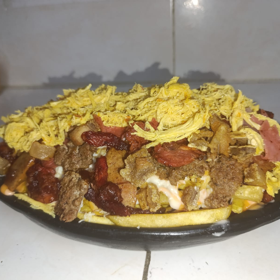 Ideal para 3 personas . Papas a la Francesas , salchichas , salsas , ripio de papa, jamon ,queso mozzarella, tocineta ,costilla ahumada , chorizos y pollo desmechado