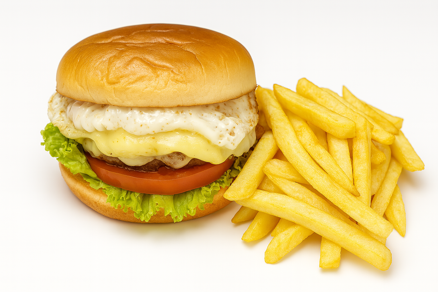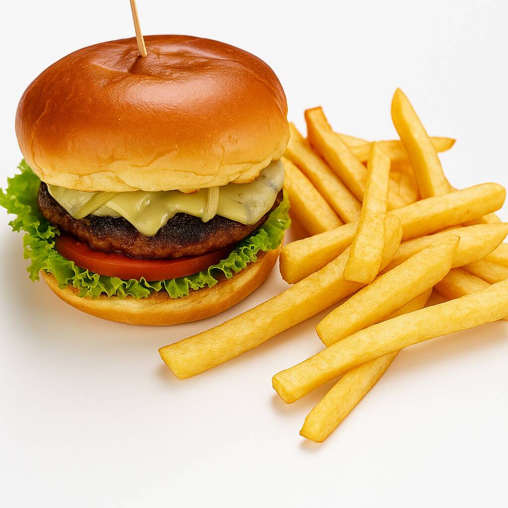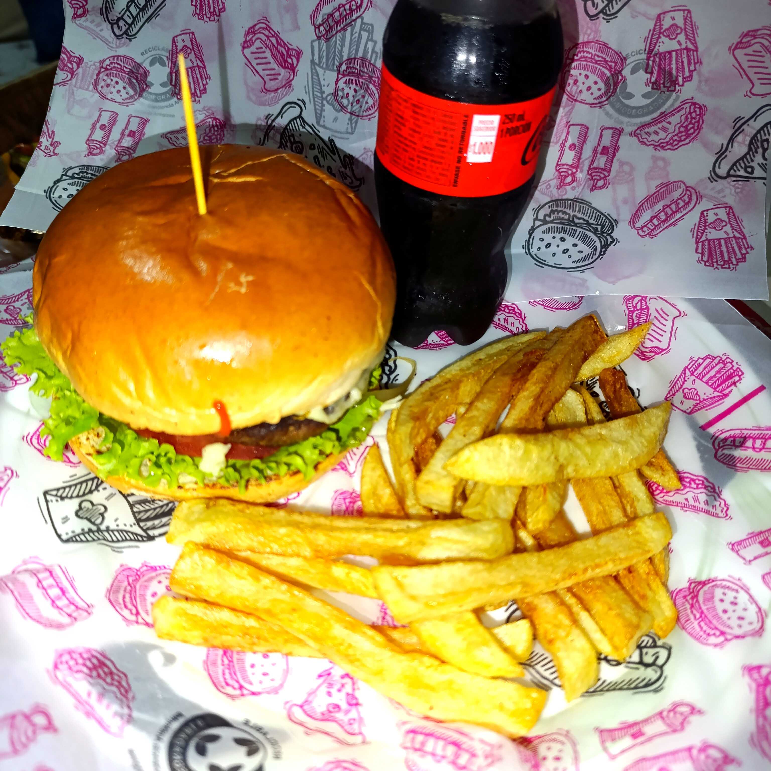 Pan, carne, lechuga, tomate, cebolla caramelizada, loncha de queso, salsa de la casa., acompañada de papas a la francesa y cocacola 250ml