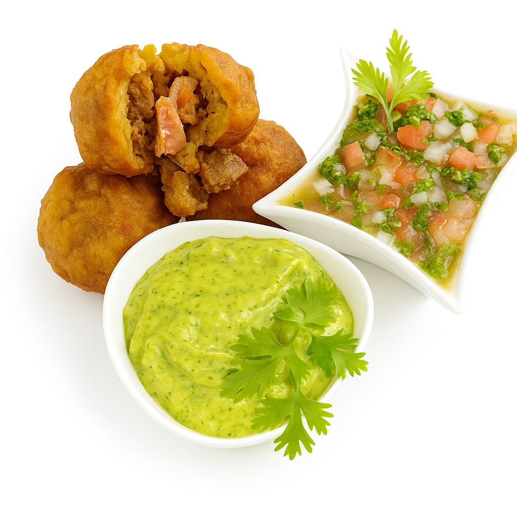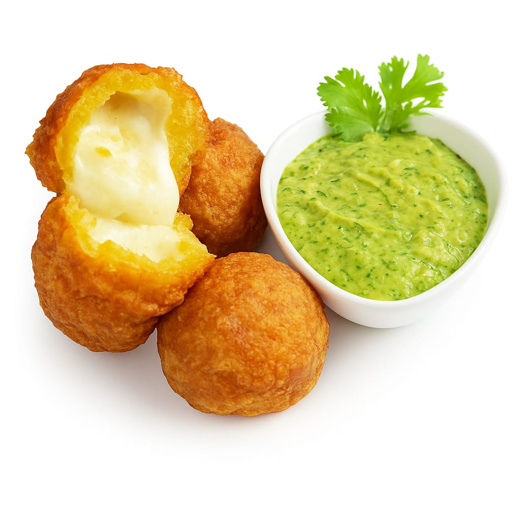 4 Deliciosas bolitas de plátano maduro, rellena de chicharrón, ají, guacamole.